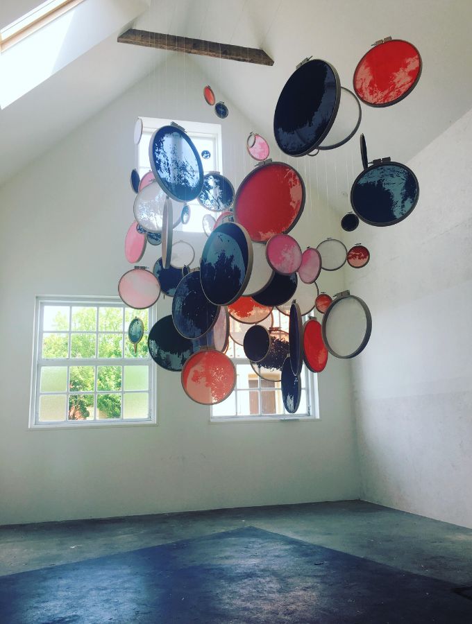 "Desuden laver jeg mange ting ud fra min tekstiluddannelse. Mange af mine værker er taktile og har et tekstilt udtryk, selv om materialet ikke er af tekstil. Min seneste installation var på Roskilde Festivalen til restaurant-konceptet Food Is Now med bl.a. Restaurant Amass, hvor jeg indfarvede gamle brugte duge fra dampvaskerierne med indigo, der gjorde, at det fik en hav-lignende fornemmelse - dér midt på græsplænen på festivalen. Jeg elsker at skabe stemninger og illusioner, og det er noget, jeg ofte bruger i mit arbejde. Desuden arbejder jeg gerne på spejle. Jeg synes, at refleksioner er så interessante. Jeg har en gruppeudstilling på Arden Asbæk til oktober, som jeg ser meget frem til, hvor man kan se netop dette udfolde sig."
