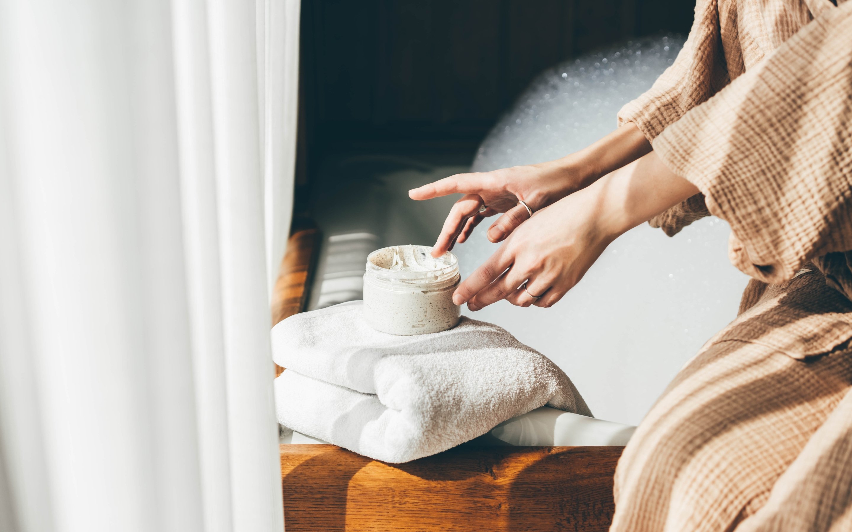 Spadagen starter i badet, enten under bruseren eller endnu bedre – i badekaret. Er du den heldige indehaver af et badekar, så bland blødgørende badeolie i badevandet eller skrub hele kroppen blød med en bodyscrub under bruseren. Husk at skrubbe ekstra grundigt til ved fødder, ankler, knæ og albuer, hvor vi har tendens til at få meget tør hud.