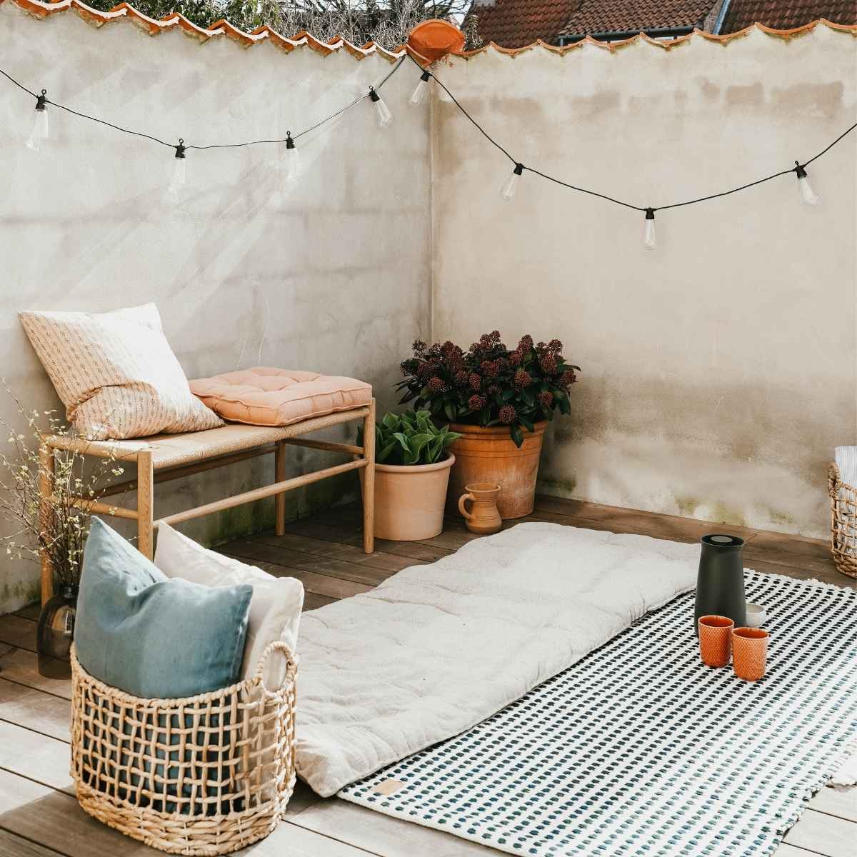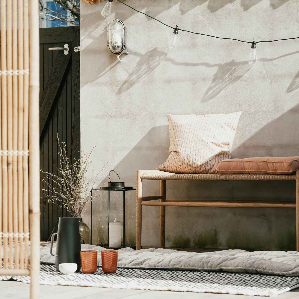''Jeg bruger vores FDB-bænk udenfor om sommeren (når det ikke regner, naturligvis), for det er en nem måde at få ekstra siddepladser på. Samtidig bruger jeg gerne naturmaterialer i min indretning udenfor, fordi det skaber ro og smelter fint sammen med omgivelserne udenfor. Jeg er vild med bl.a. flet samt træmaterialer som eg og bambus fordi det giver en varme til uderummet og gør det hele meget mere intimt og hyggeligt.''