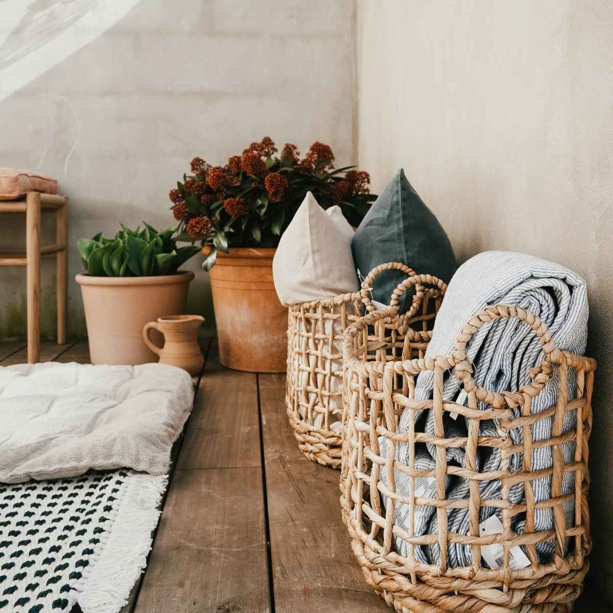 ''Skab en hyggelig krog i dit uderum med masser af bløde tekstiler, som du nemt kan hive ud på græsset eller ned på terrassegulvet. Brug plaider, tæpper, puder, tykke hynder eller hvad du nu har. Puder er nemme at stable og bruge som ’ryglæn’. Store vamsede hynder kan bruges som en udemadras eller blot som ekstra blødt til bagdelen på en bænk. Har du børn vil de også nyde godt af de mange gode tekstiler, som de kan boltre sig løs i, bygge huler med tæpper og puder. Og hele familien kan slænge sig på en god madras, med puder og tæpper til en god film udenfor i sommerens lune brise.''